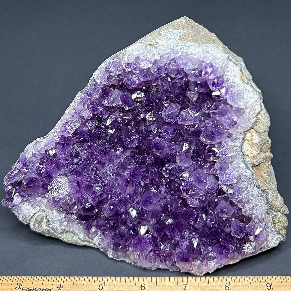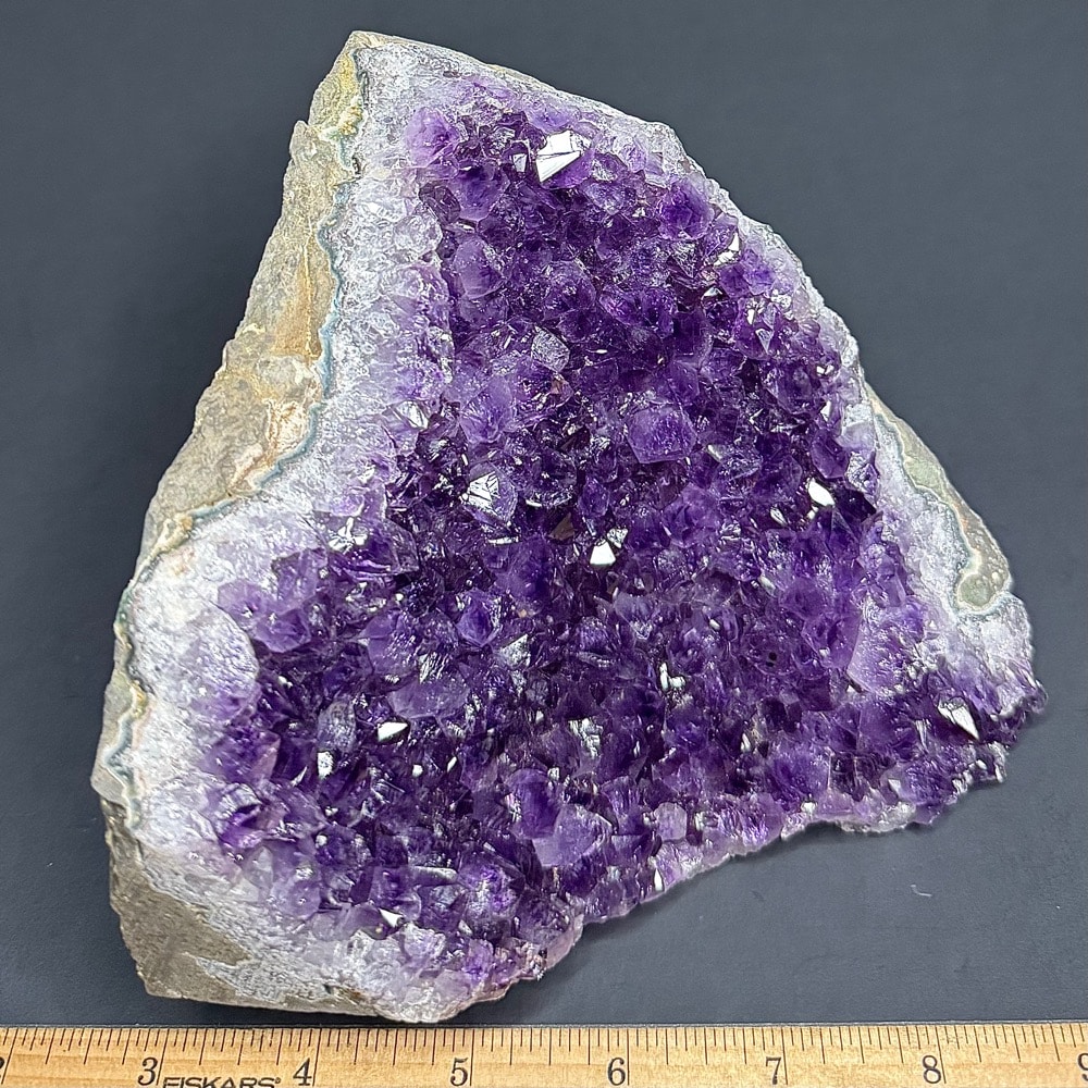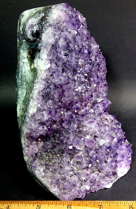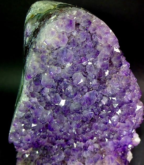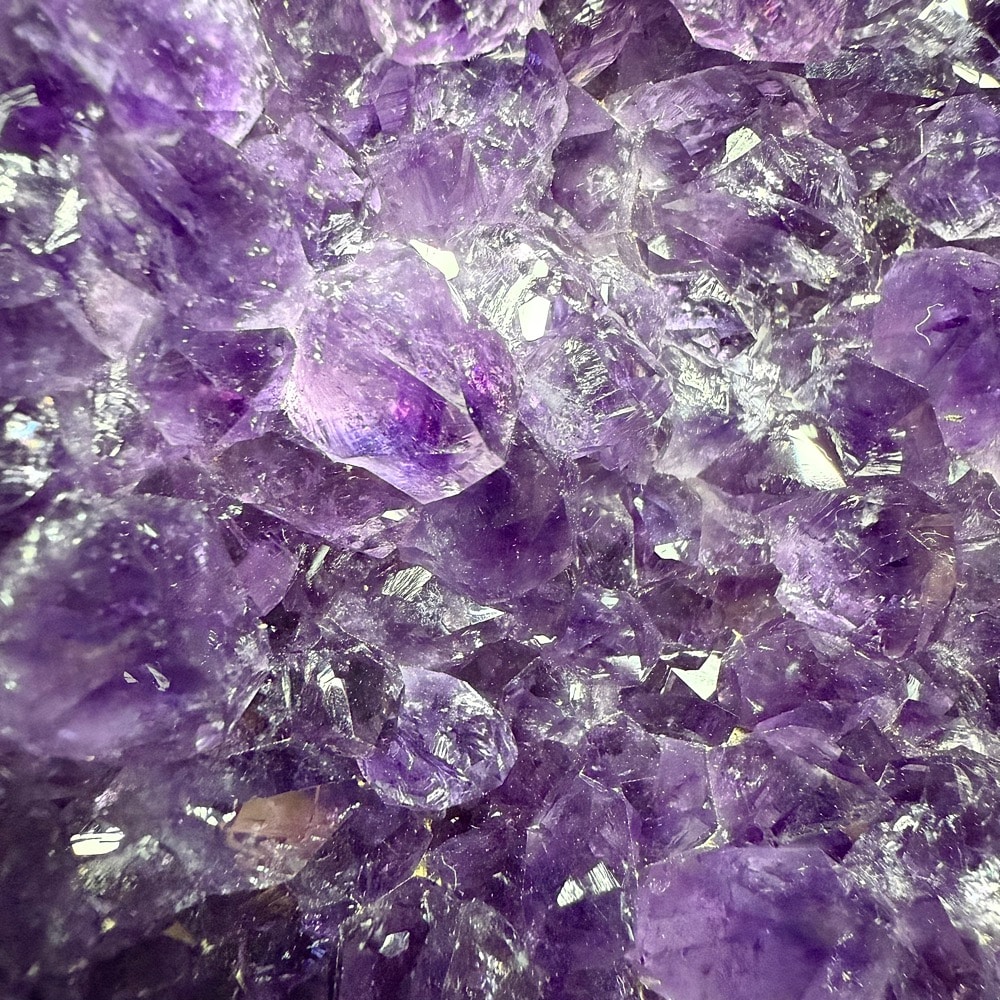 Appearance: Sparkly Amethyst crystals with high quality deep purple color. Natural unpolished with cut base for display.