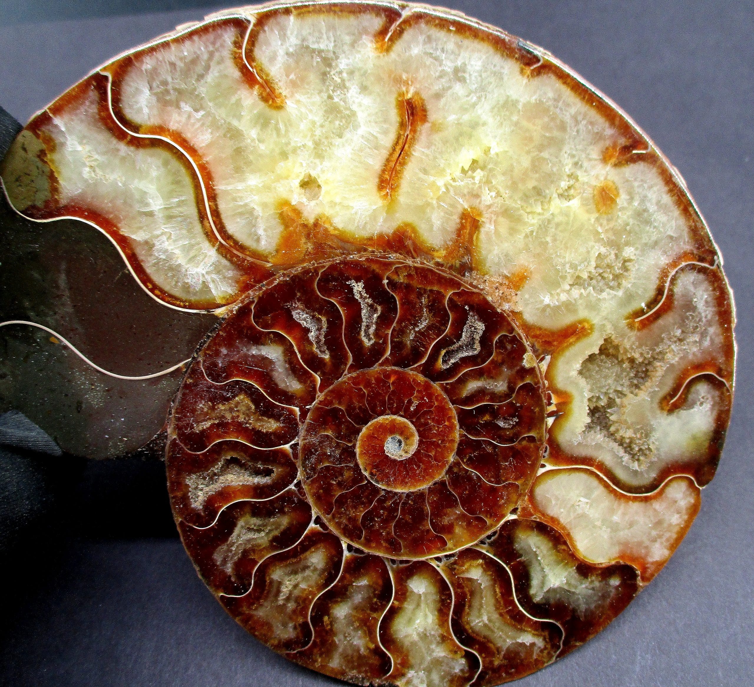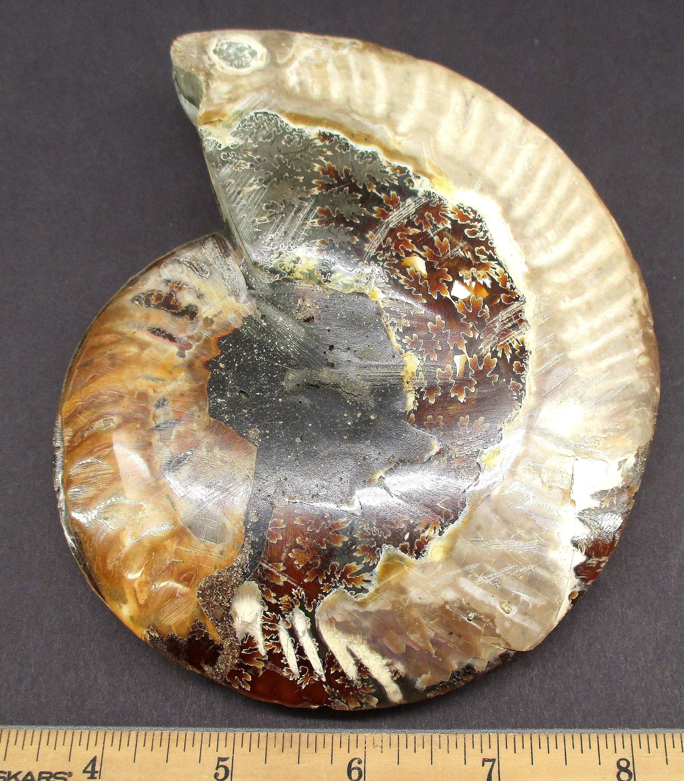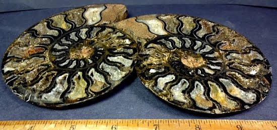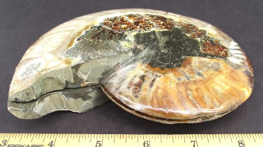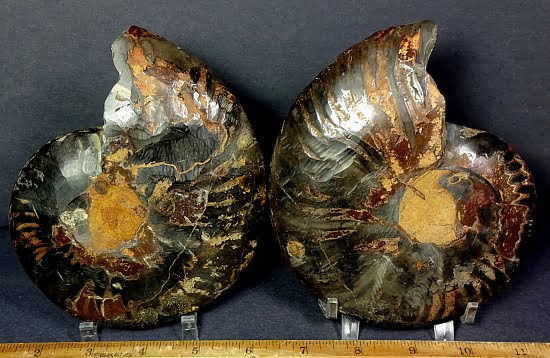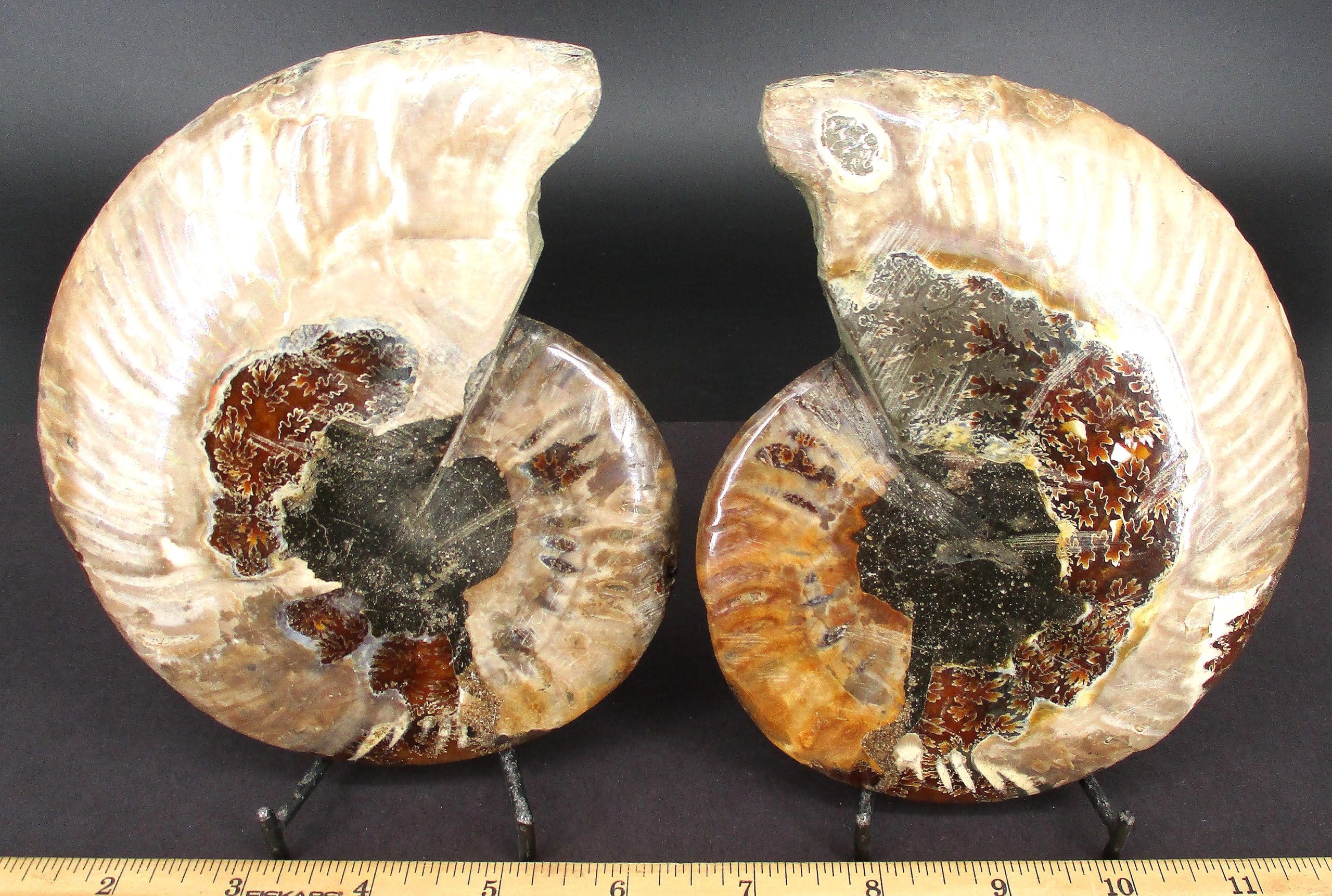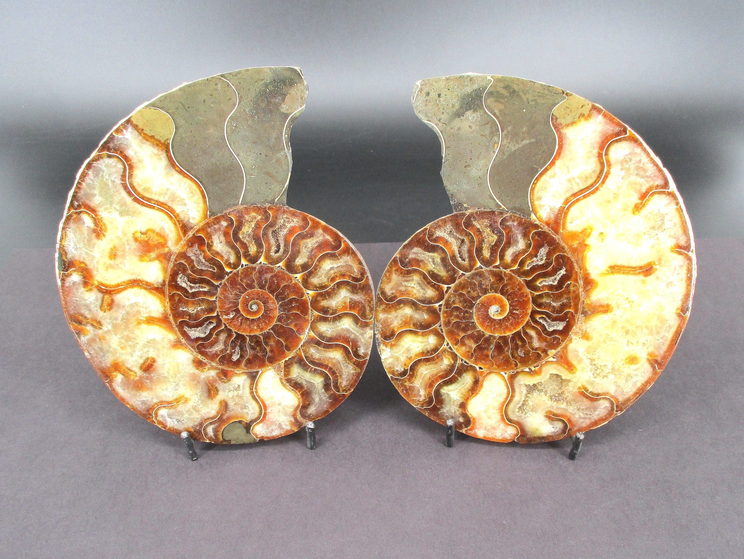 Here is a matched pair of a polished Ammonite halves from Madagascar.   This nice Ammonite has been nicely polished to show the inner beauty.  It measures 5 1/4″ x 4 1/2″ x 1 3/8″ thick and has great details.  The Ammonite has a brown crystallized center of yellow Calcite and Aragonite. Very nice!
