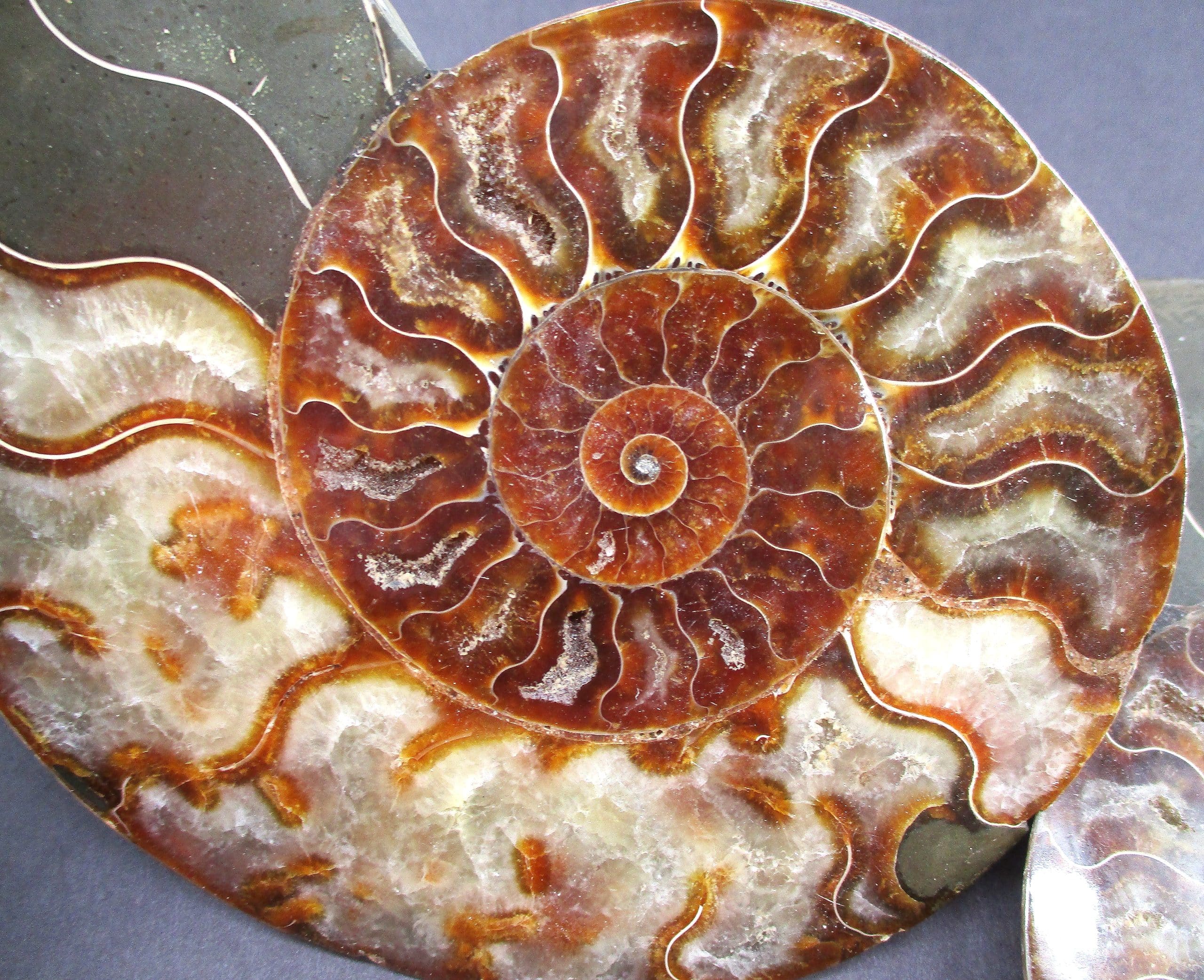 Ammonites are extinct members of the cephalopod group of mollusks.  Only a limited number of species have survived to the present day which includes the squid and the chambered nautilus.  Ammonites had a multi-chambered shell, and added more chambers as it grew, always living in the outer chamber.  They lived in the Cretaceous period some 63 to 130 million years ago.