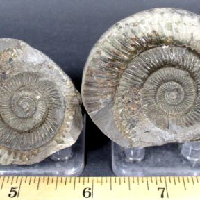 Ammonites are extinct members of the cephalopod group of mollusks. Only a limited number of species have survived to the present day which includes the squid and the chambered nautilus. Ammonites had a multi-chambered shell, and added more chambers as it grew, always living in the outer chamber.  They lived in the Cretaceous period some 63 to 130 million years ago.