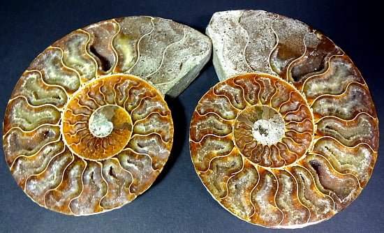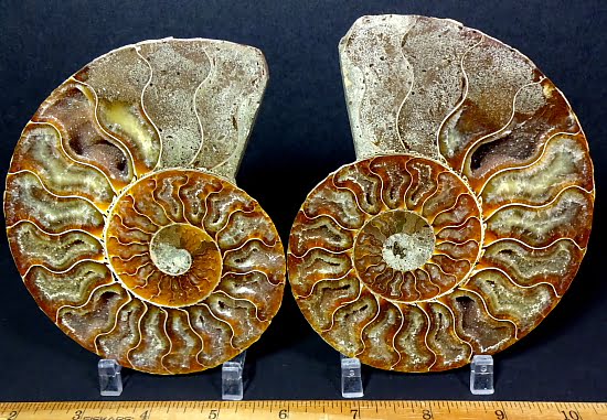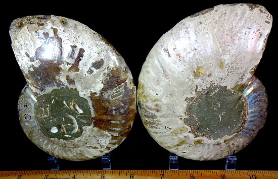 Appearance: The exterior has been ground smooth and nicely polished to show the suture lines. It has a crystallized center of Yellow Calcite and Brown Aragonite and is a matched pair. There are some colorful “iridescences” on the outside of the Ammonite. UV Fluorescent.