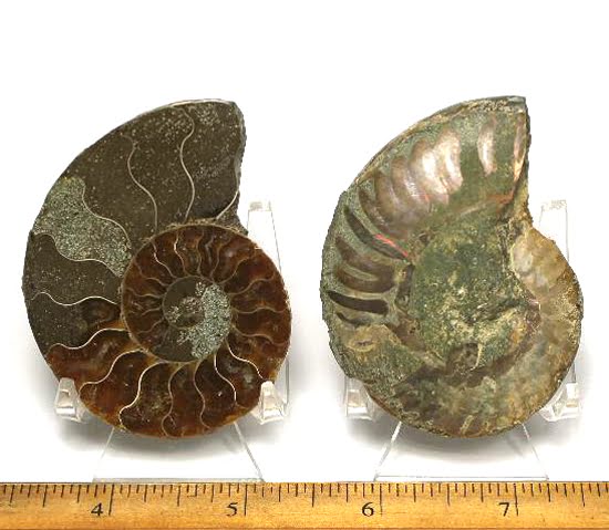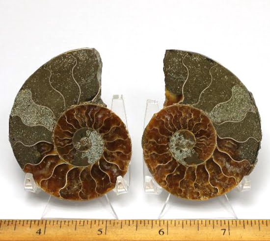 Ammonites are extinct members of the cephalopod group of mollusks. Only a limited number of species have survived to the present day which includes the squid and the chambered nautilus. Ammonites had a multi-chambered shell, and added more chambers as it grew, always living in the outer chamber. They lived in the Cretaceous period some 63 to 130 million years ago.