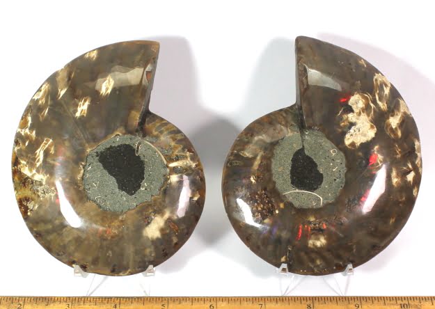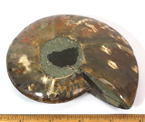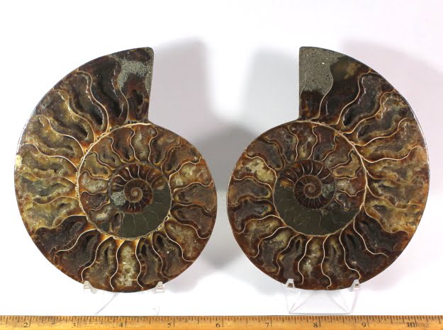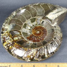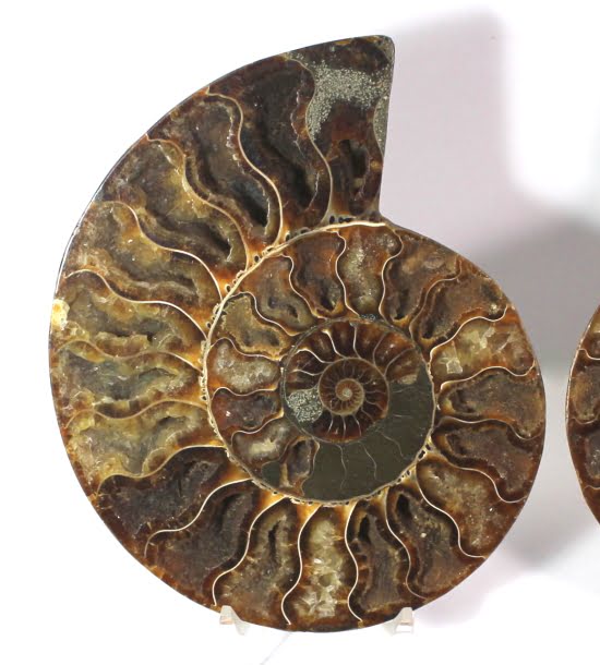 Ammonites are extinct members of the cephalopod group of mollusks. Only a limited number of species have survived to the present day which includes the squid and the chambered nautilus. Ammonites had a multi-chambered shell, and added more chambers as it grew, always living in the outer chamber. They lived in the Cretaceous period some 63 to 130 million years ago.