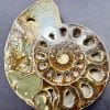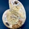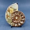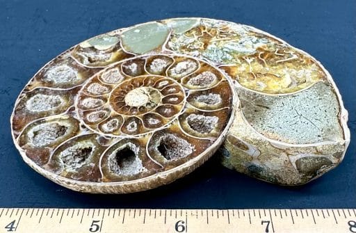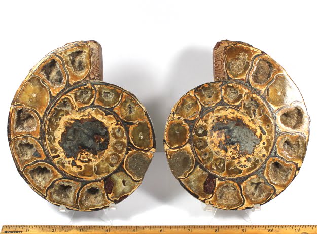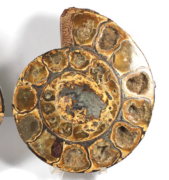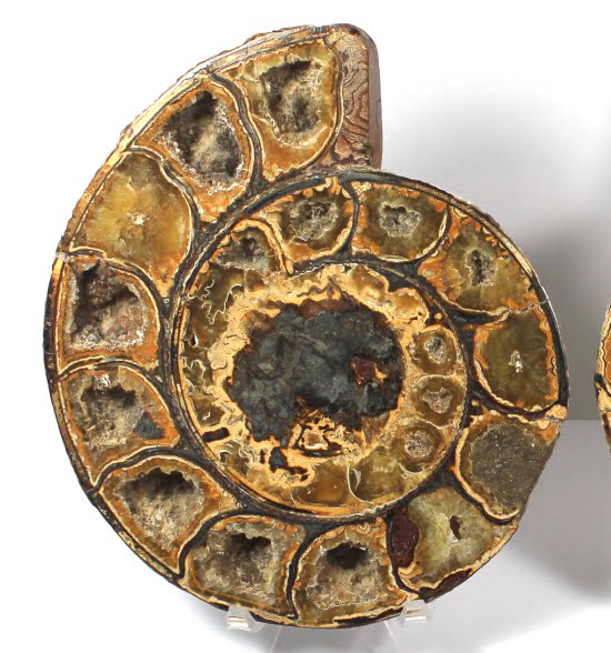 Appearance: The exterior has been ground smooth and nicely polished to show the suture lines. It has a crystallized center of Yellow Calcite and Brown Aragonite.