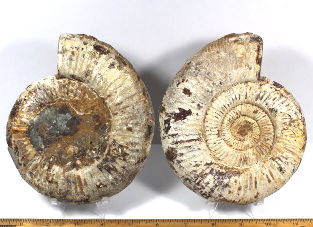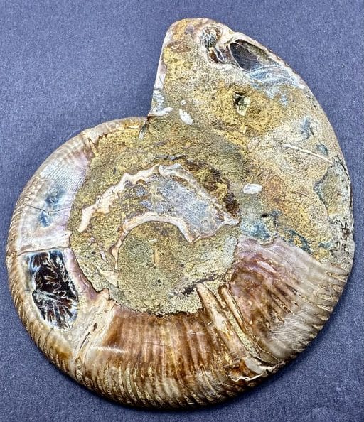 Ammonites are extinct members of the cephalopod group of mollusks. Only a limited number of species have survived to the present day which includes the squid and the chambered nautilus. Ammonites had a multi-chambered shell, and added more chambers as it grew, always living in the outer chamber.  They lived in the Cretaceous period some 63 to 130 million years ago.