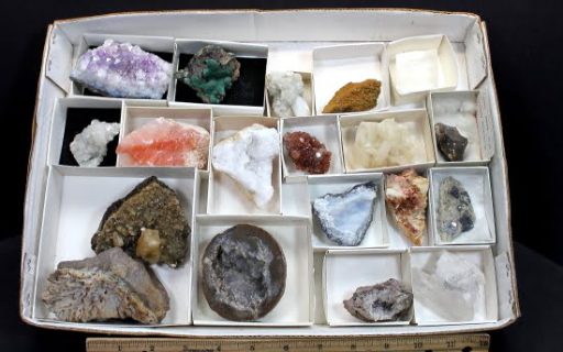 Here is a flat of 20 assorted minerals. They vary in measurement and the minerals range from Amethyst, Zeolites, Vanadinite, geode pieces and much more. There is no choice in what minerals you will receive. The picture is a representation of what you might receive and is not what you will be receiving exactly.