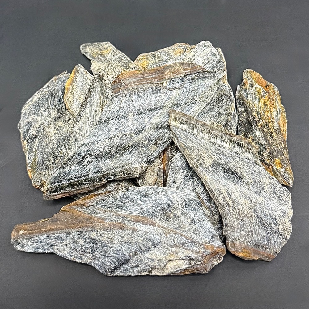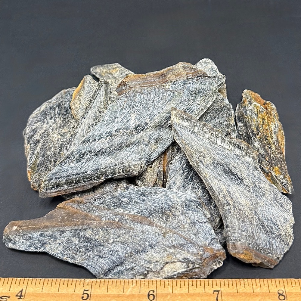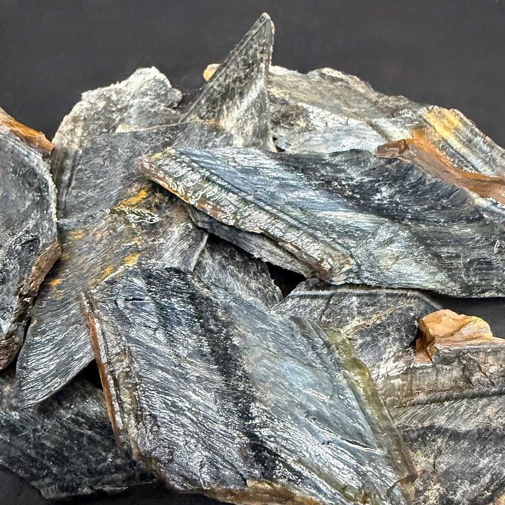 Appearance: Five-pound bag of Blue Tiger Eye. This particular batch is thin and chippy. Great material for the creative and adventurous soul.