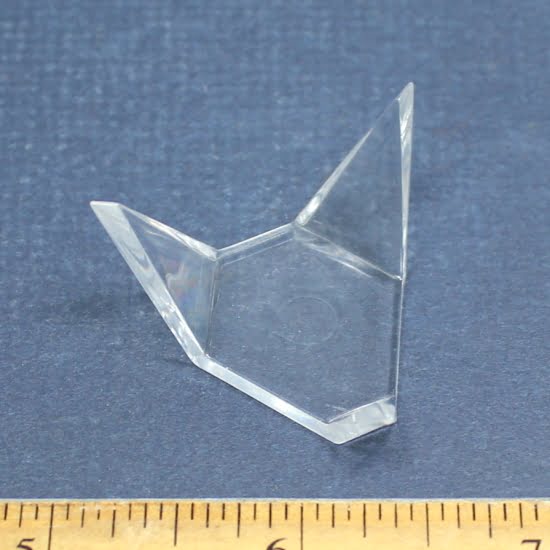 2PD6 This is a low profile triangular shape stand. It works nice for small geodes and specimens. It is approximately 1 1/2″ x 1 1/4″ wide. The back prongs are 3/4″ tall and the front prong is 3/8″.