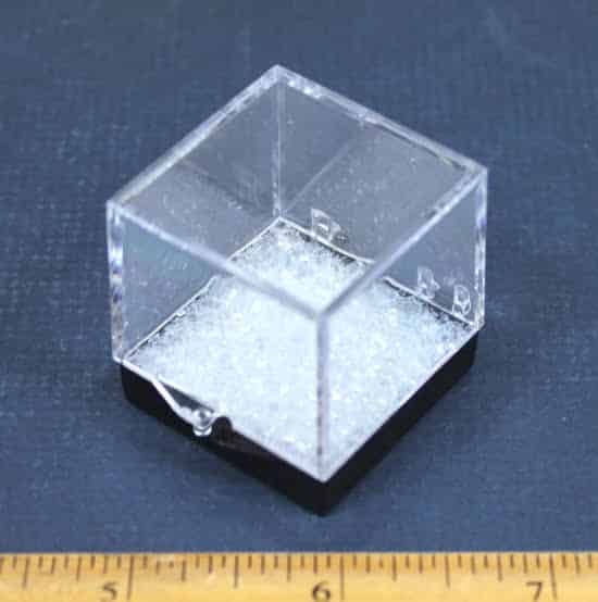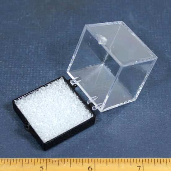 PD12 This is a small plastic box with a black base for displaying small objects and specimens. It measures 1 1/4″ x 1 1/4″ x 1 1/4″ in height and has a removable Styrofoam insert. These are great for displaying micro mount or small minerals.