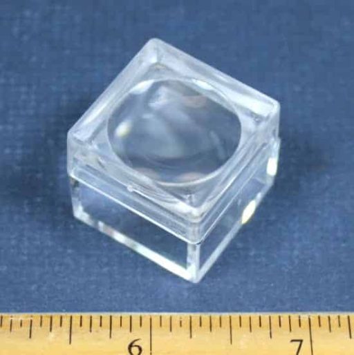 PD17 This is a small size magnifying plastic boxes measuring 1″ square and 1″ deep. They work great to add a little magnification for micro mount minerals, gold specimens or other small items.