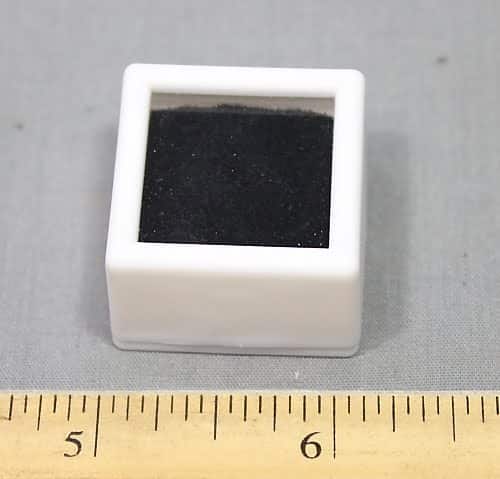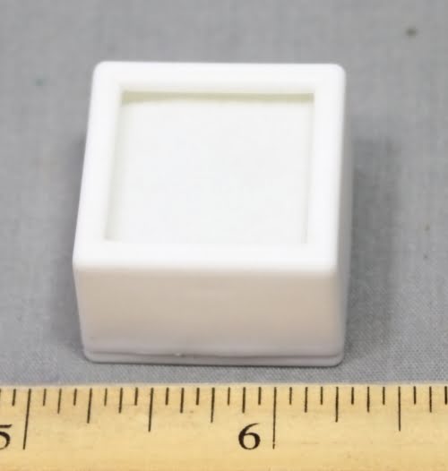 PD19 This is a square white plastic display box with a reversible black and white velvet lined foam. It measures 25mm by 25mm and is 15mm deep. They work great for displaying faceted stones, gold nuggets and other small items. These will work for replacements in the velvet and foam lined display boxes used for stones, etc.