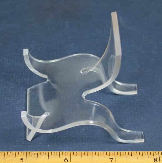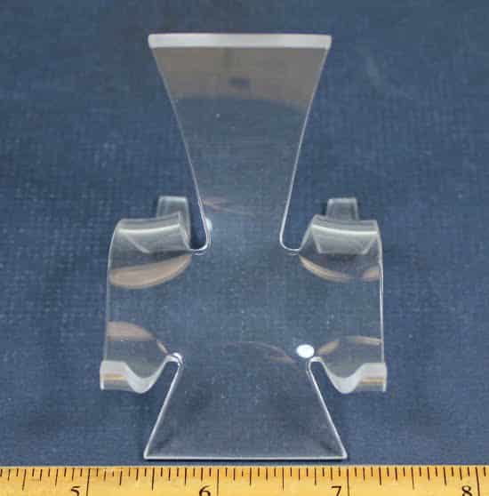 PD7 This is a clear curved plastic display stand (a more laid back style to accommodate thicker minerals and specimens). It measures 2 1/4″ wide x 2 5/8 tall x 2 3/4″ deep.