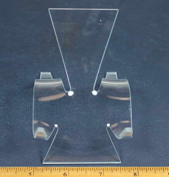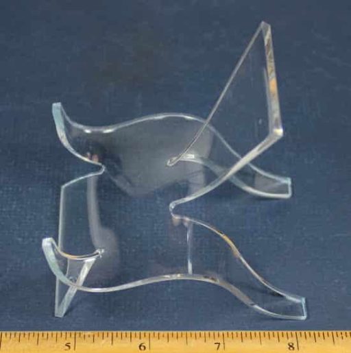 PD8 This is a clear curved plastic display stand. It measures 2 3/4″ wide x 3 1/2 tall x 3 1/2″ deep.