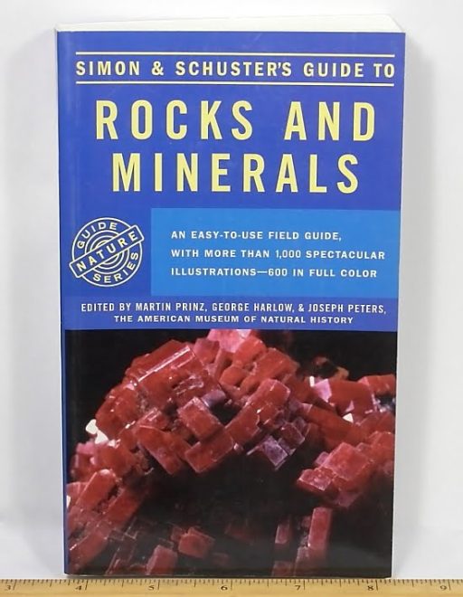 BK1 Simon & Schuster’s Guide to Rocks and Minerals by by Annibale Mottana, Rodolfo Crespi and Giuseppe Libori – An easy to use field guide, with over 1,000 spectacular illustrations – 600 in full color This book covers in depth most minerals, their composition and formations, how to identify them as well as how and where they form and has 64 pages of color pictures and descriptions of minerals. It measures 4 1/2″x 7″; 607 pages.