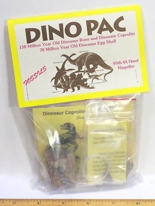 K201 This is a Dinosaur Fossil Kit. Enclosed is 3 different specimens. They are, a piece of Dinosaur Bone, Coprolite (dino dung) and a piece of a Dinosaur Egg shell. The kit comes with a nice description about Dinosaurs & their history, also included is a geological timeline chart. This is a great gift item for kids or to put with your own fossil collection.