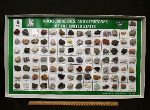 K319 Here is a nice arrangement of Rock and Mineral samples of the United States elegantly displayed inside a box. The items range from Native Copper to Kyanite to Rose Quartz to Pyrite to Feldspar. This makes an excellent teaching tool to show the different rocks and minerals in their natural unaltered appearance.