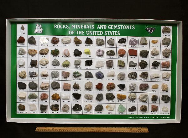 This arrangement has 100 different colorful specimens. Each specimen is securely glued to it’s own individually labeled spot. This set also comes with a 16 page booklet as an introductory study guide. The box measures over 20″ x 12 1/4″ x nearly 1 1/8″ deep.