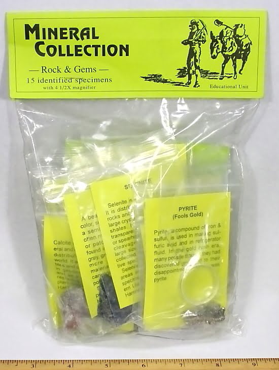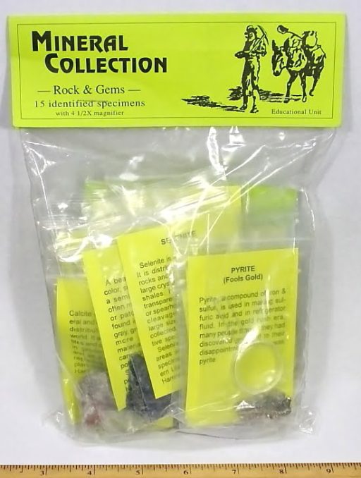 K300 This is a Mineral Collection Kit. Enclosed is 15 different identified specimens. They are, Amazonite, Quartz, Agate, Alabaster, fossiliferous Limestone, Fluorite, Gold Ore, Marble, Pyrite, Calcite, Jasper, Obsidian, Pumice, Copper Ore, Lava Rock, Selenite, Lepidolite and Variscite. The kit comes with a write up about sedimentary, igneous and metamorphic rocks. Each specimen comes in its own bag. This is a great learning item for kids.