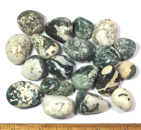 K119 This is for 1/4 pound of tumbled Green Tree Agate.  There are approximately 8-12 pieces per 1/4 pound.  These stones will vary in size. This is pretty, very colorful material with very detailed, unique designs.