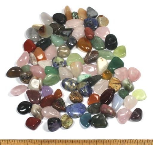 They will vary in size and shape. Some of the stones that may be included in the mix is Carnelian, Picture Jasper, Snowflake Obsidian, Tiger-Eye, Sodalite, Unakite, Crystal Quartz, Rose Quartz, Dalmatian Stone and others. Item will be similar to the picture.