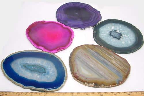 K122 Here are some very beautiful and new to The Rock Shed,  large Brazilian Agate slabs in natural and color enhanced colors.  These 1/8 – 1/4″ thick slabs come in various sizes from approximately 5″ to 6″ and are polished on both sides.  These will be sold in sets of 3 slabs as they come from the box.  The photo is a small representative of the colors and patterns on hand.  Unfortunately, there is NO choice in color or size, as we package directly from the box.  However, we do guarantee a nice selection.  This would make a great educational tool