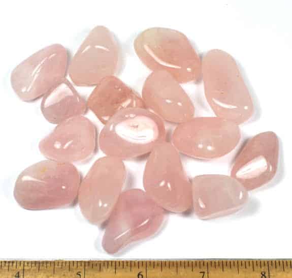 K115 This is 8+ pieces of tumbled Rose Quartz.  These stones will vary in size and shape but mainly range between 3/4″ and 1 and 1/4″.  This is a pretty Rose Quartz with some white accents.