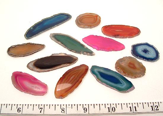 K120 Here is a nice set of small Brazilian Agate slabs.  Some are naturally colored and some are color enhanced.  This is a random grouping that will resemble the picture and  include five (5) different pieces of nicely colored Agate slabs.  Unfortunately, there is NO choice in color or size, as we package directly from the box.  However, we do guarantee a nice selection.  This would make a great educational tool or a great project for the wire wrapper.