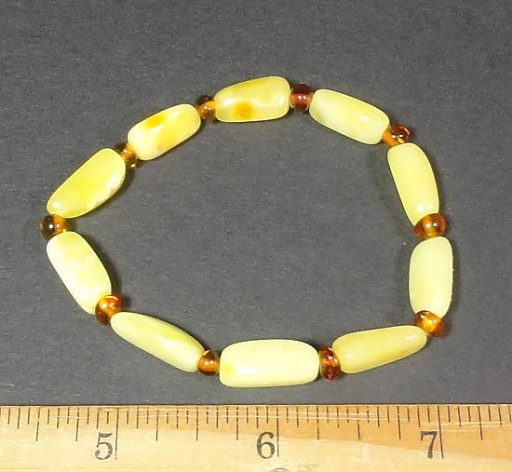 AM205 Here is a very nice Amber bead stretch bracelet. The bracelet measures approximately 2 1/2″ in diameter and has honey yellow colored freeform amber beads alternating with smaller round freeform dark colored amber beads.