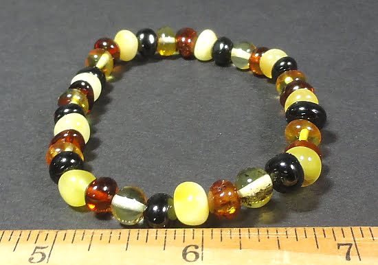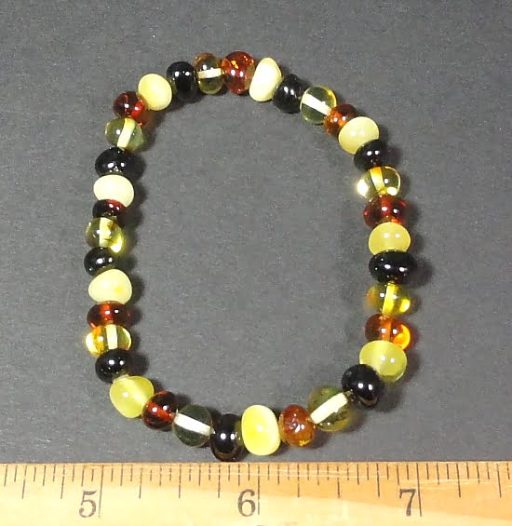 AM206 Here is a very nice Amber freeform bead stretch bracelet. The bracelet measures approximately 2 1/2″ in diameter and has varying shades of amber beads in an alternating pattern.