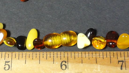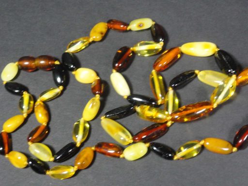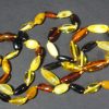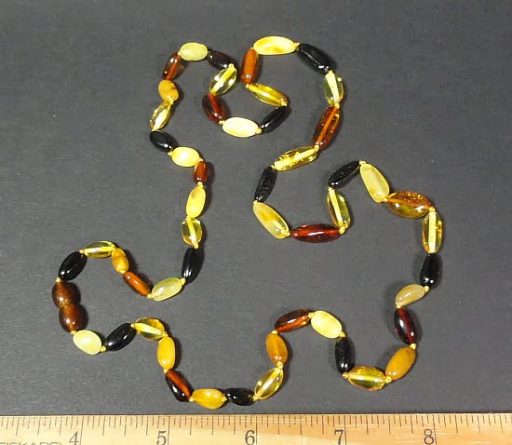AM100 This is a pretty multi colored Amber bead necklace made from Baltic Amber. These are freeform Amber beads measure approximately 5 – 15 mm with the larger of the beads in the front of then necklace and the smaller in the back by the clasp. This necklace measures approximately 26″ and has a good selection of above average Amber freeform beads in multiple sizes and colors.