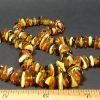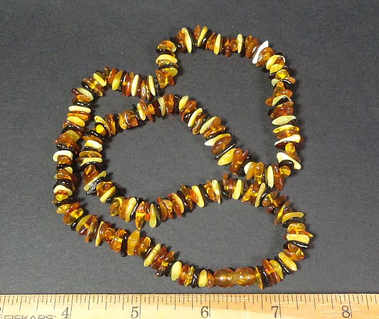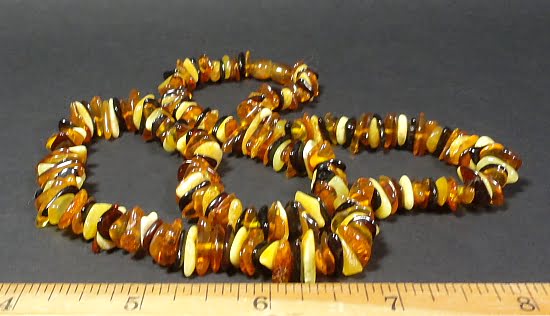 AM103 This is a pretty Amber chip bead necklace. The Amber chip beads measure approximately 5 mm in size near the twist close clasp and gradually get larger up to approximately 10 mm.  This necklace measures approximately 20″ in length and is made from multiple shades of Baltic Amber.