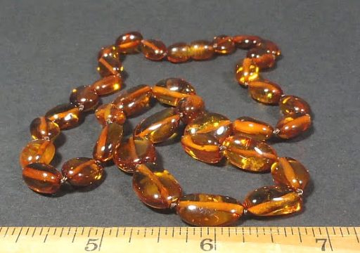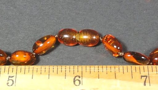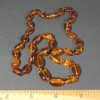 AM107 This is a pretty Amber bead necklace. The Amber beads have a free form shape and are completely polished. They measure approximately 10mm in size near the twist close clasp and gradually get larger up to approximately 15mm and has a twist close clasp. The necklace measures approximately 18″. Very, very nice and light weight.