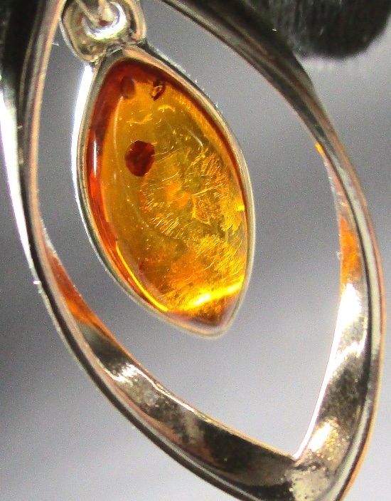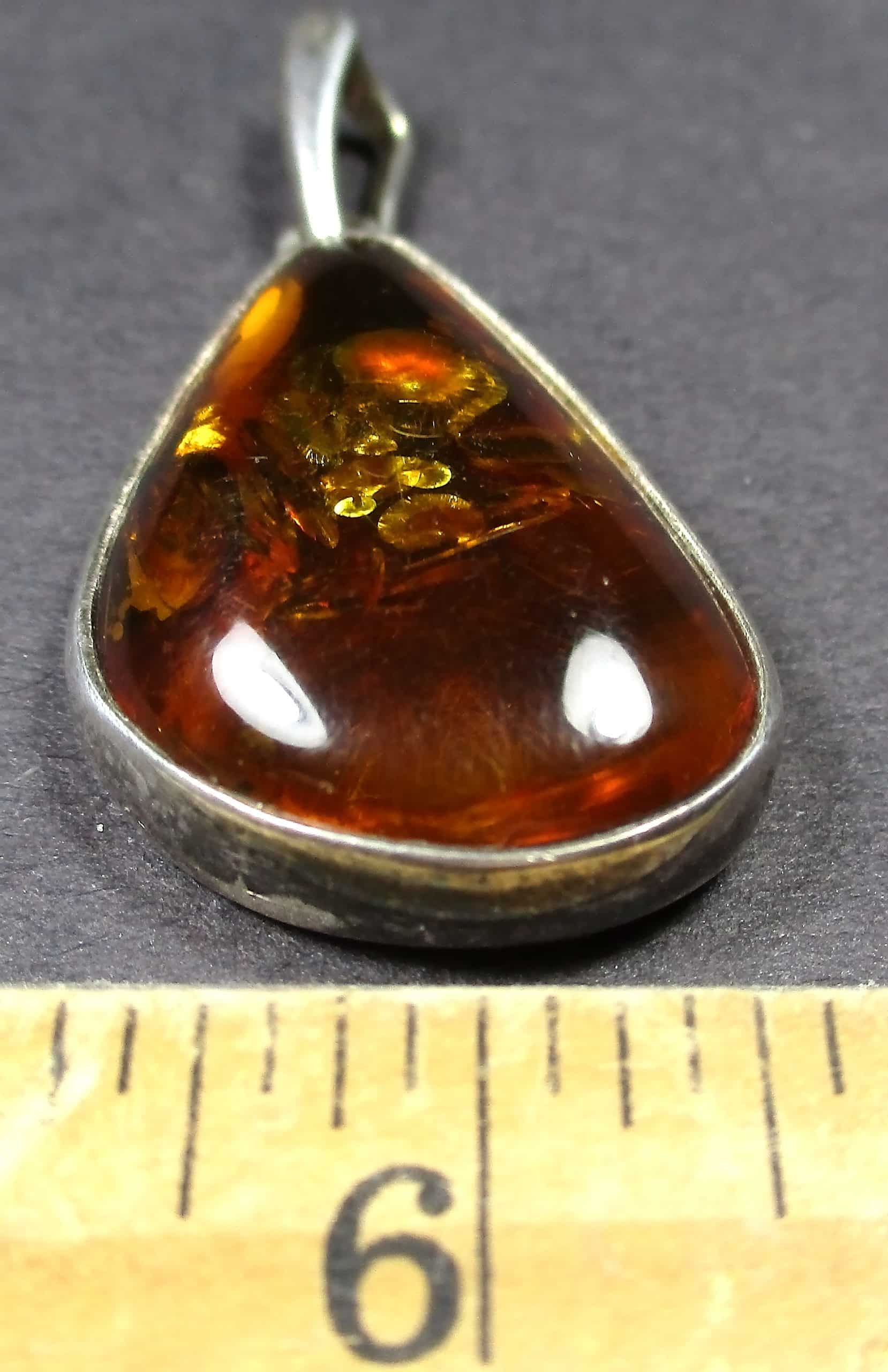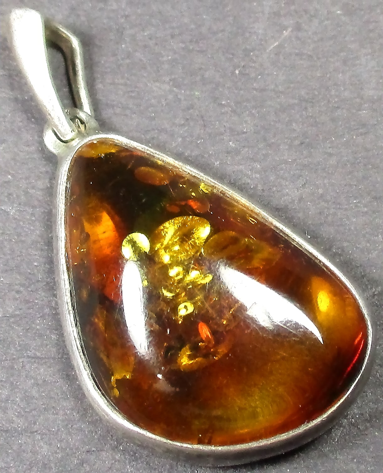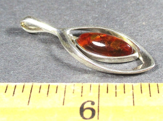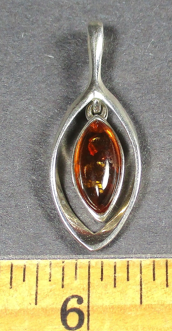PN700: – Amber Cabochon, set in a minimally designed, sterling silver mount. This piece has a rich color, mostly high clarity, with small particle clusters in the center.
