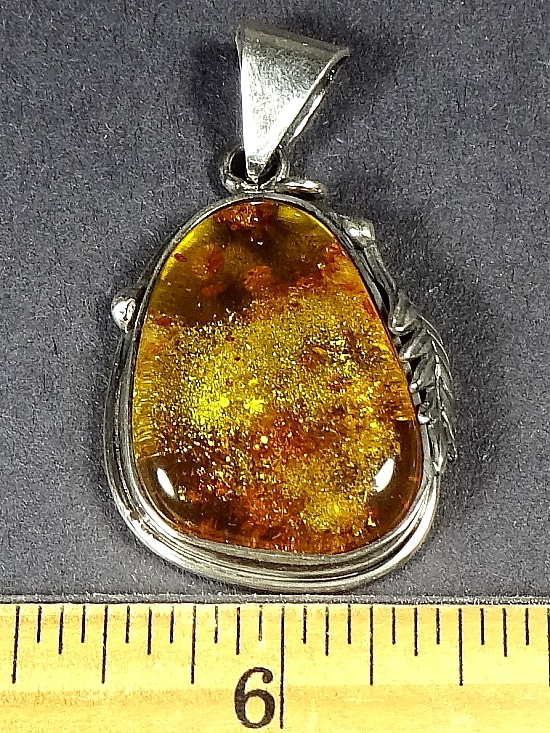 This is a very pretty sterling Silver pendant with a 22mm x 28mm  golden Amber cabochon.  This pendant measures 1 3/4″ from the top of the bail to the bottom of the setting.  The bail size is 1/4″.