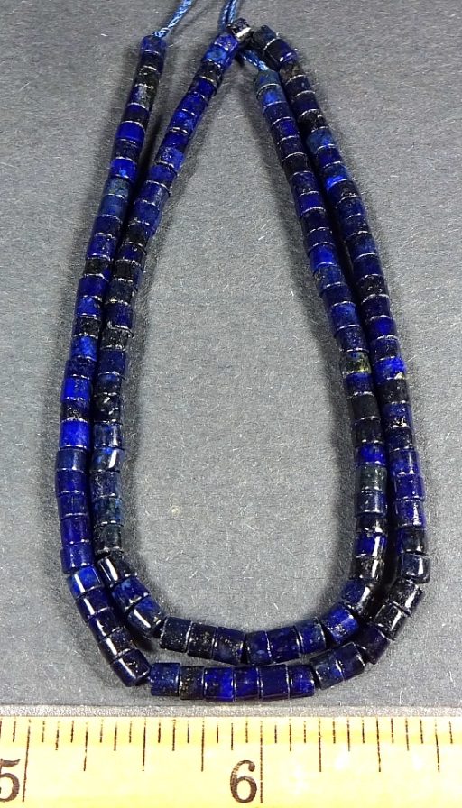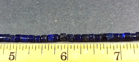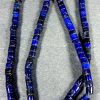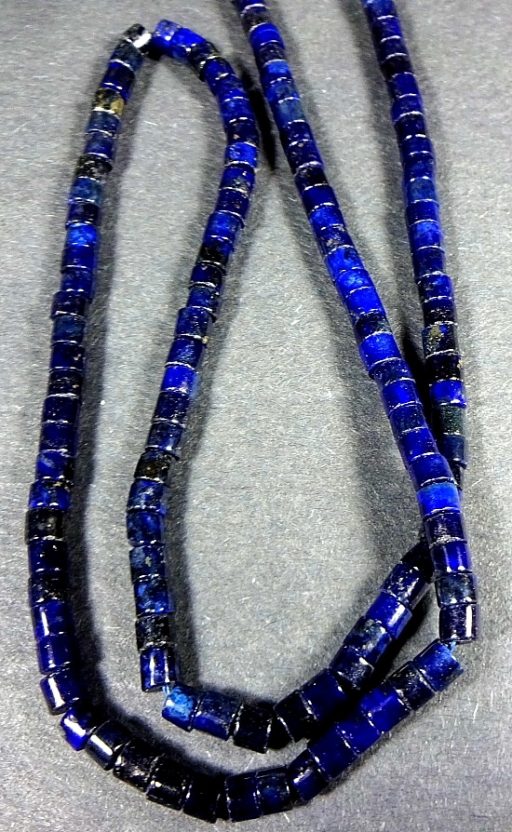 Here is a temporary strand of nicely polished Lapis barrel beads. These beads have a cylinder shape measuring roughly  1/16″.  Each strand has approximately 130 beads.