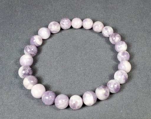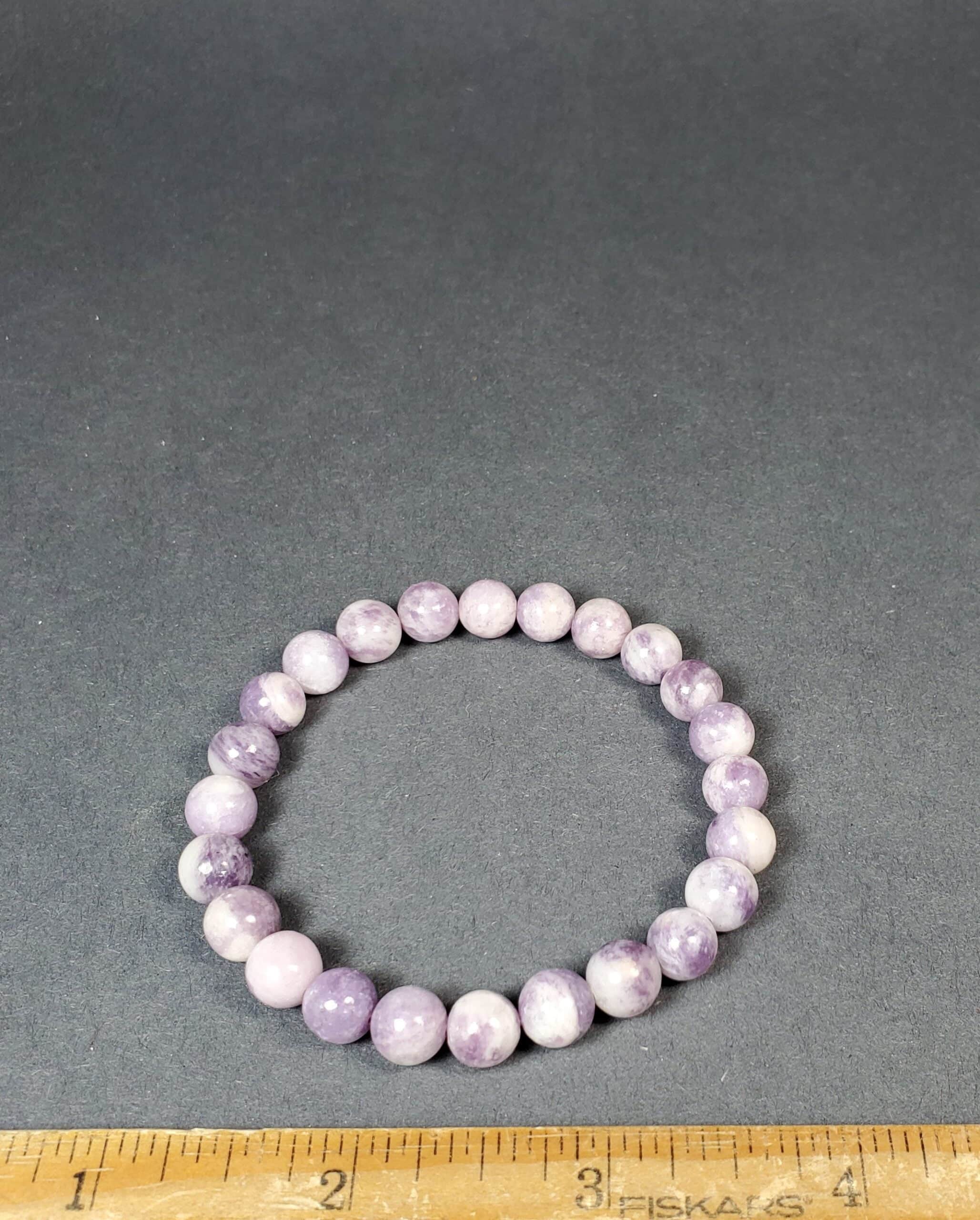 This is a very nice Lepidolite stretch bracelet made with round polished beads. It measures approximately 3″ with very nice Green opaque beads. It has a nice sparkly shine and uniquely shaded Purple colors.