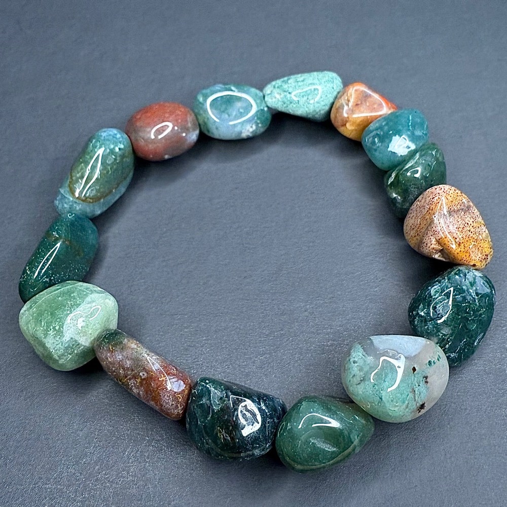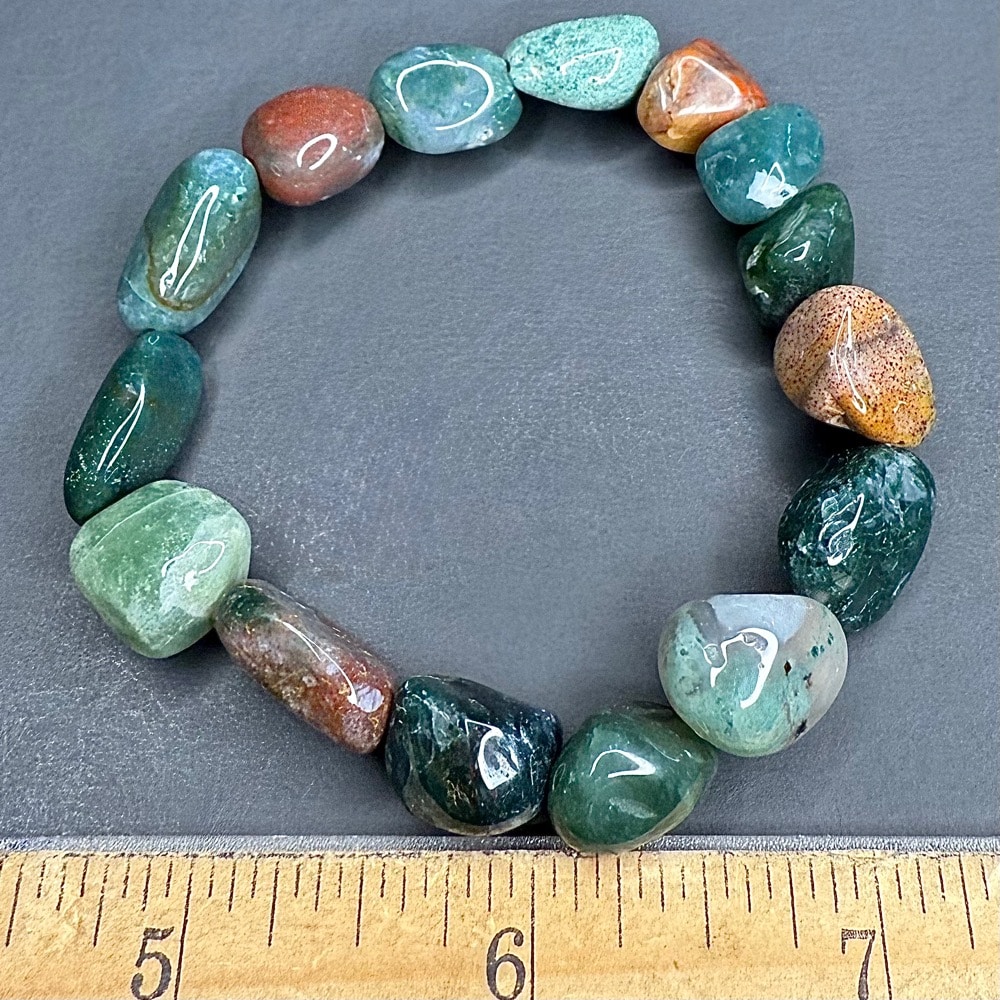Here is a gorgeous Indian Jasper stretch bracelet with gemstone chunky beads.  It measures approximately 3″ with very nice variety of jaspers and colors ranging from a hunter green to a deep red.  A very nice bracelet.