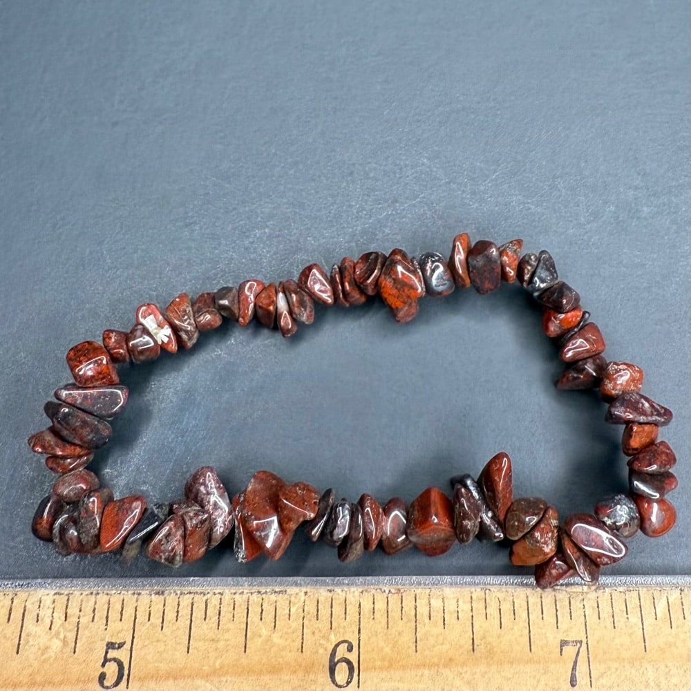 Here is a very pretty Brecciated Jasper bracelet with chip beads.  The bracelet measures approximately 3″ in diameter.  A very nice bracelet.