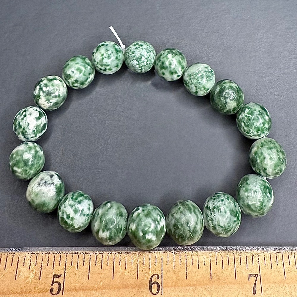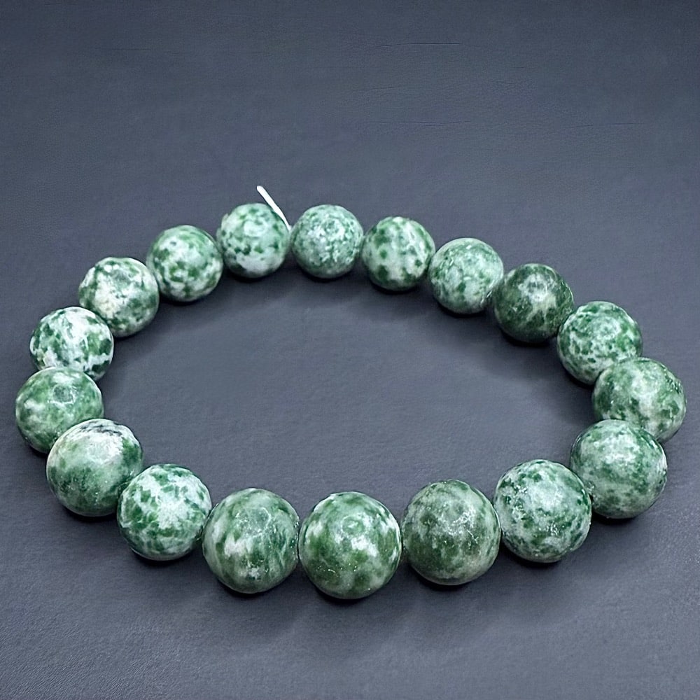 This is a new India Green Tree Agate, round bead bracelet.  It measures approximately 3″ in diameter.  It has a subtle polish, retaining its natural beauty, and a balanced medley of green and white pigmentation. Grab this one quick!