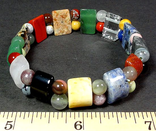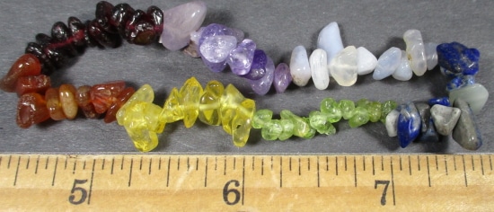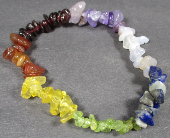 Here’s a lovely, chakra designed, multi gem stretch bracelet, made from chip bead gemstones. It measures approximately 3 1/2″ diameter. Blue Lace, Sodalite, Peridot, Citrine, Carnelian, Garnet, and Amethyst, are the colorful gemstones that make up this unique bracelet.