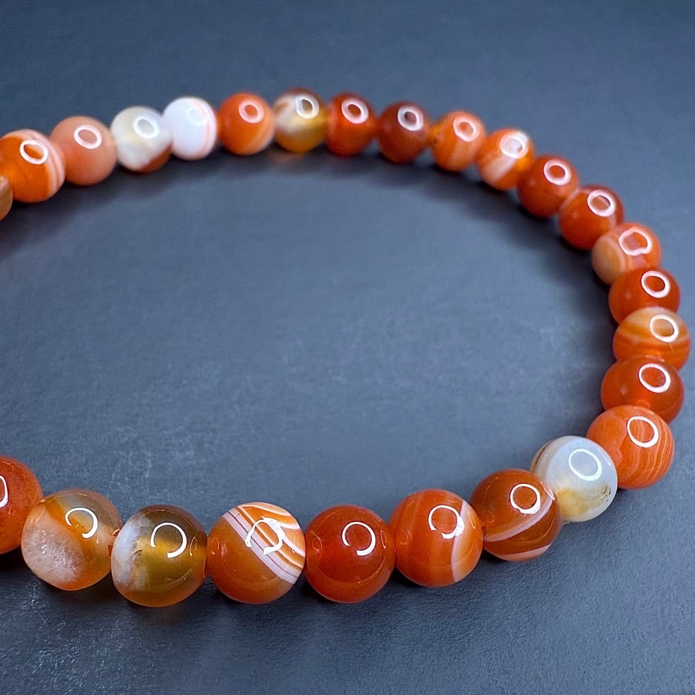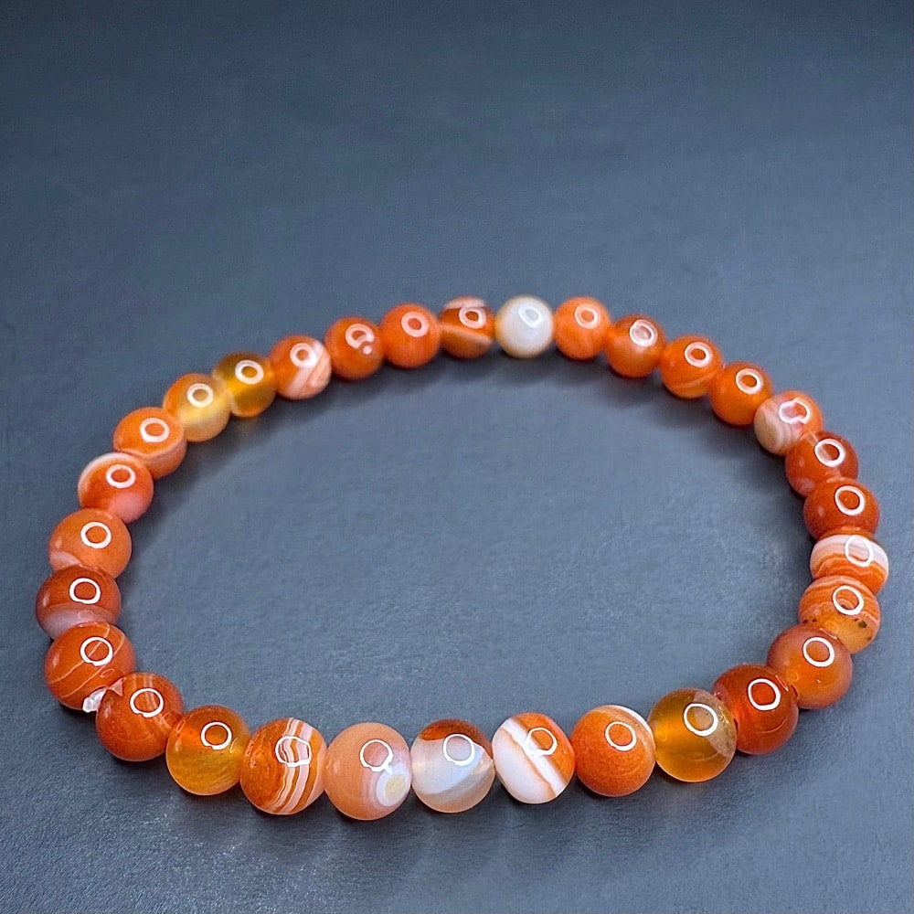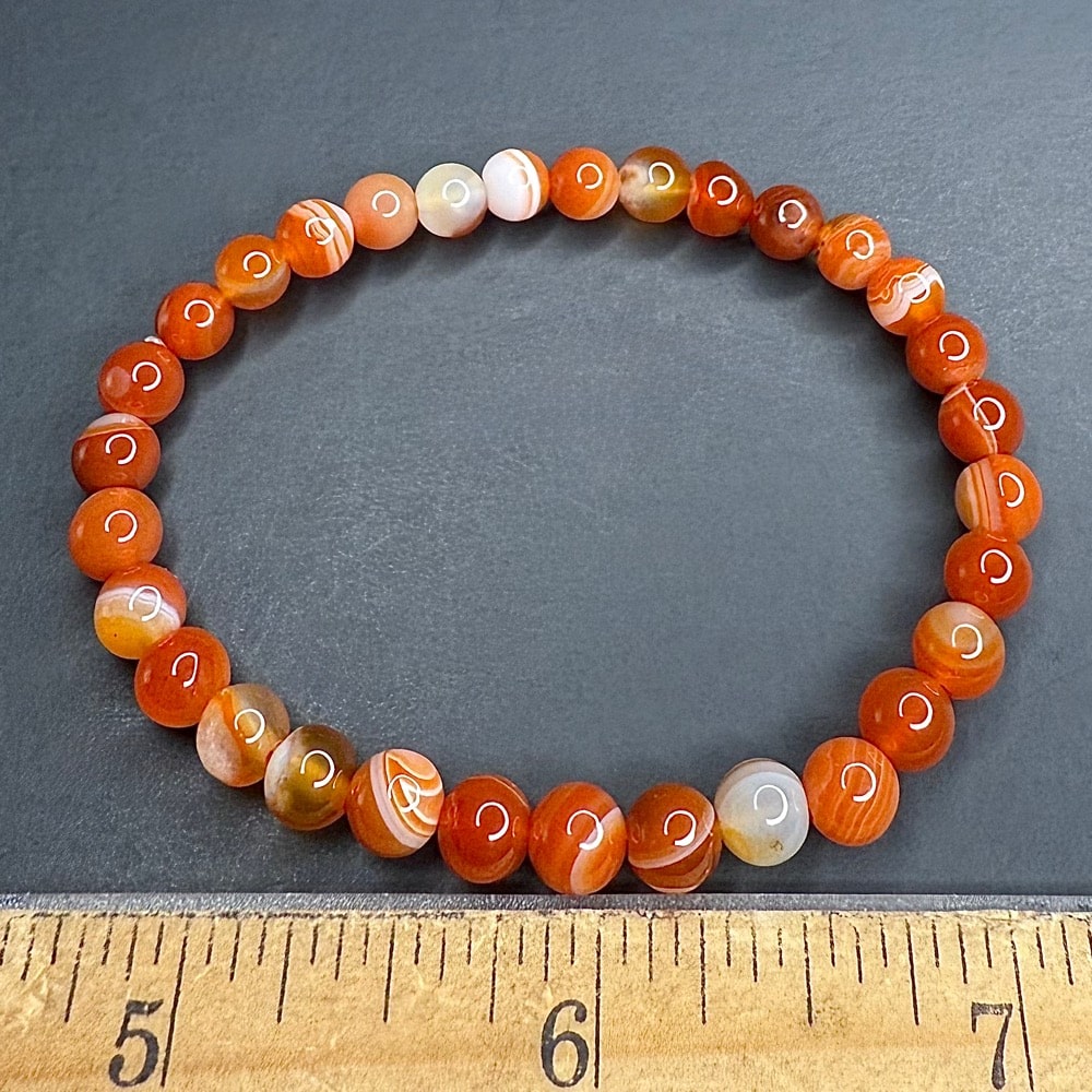 Here is a quality, stretch bracelet with red and white sardonyx beads.  Each bead measures approximately 6 mm.  The bracelet measures 3″ in diameter.