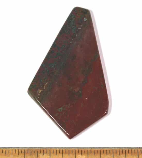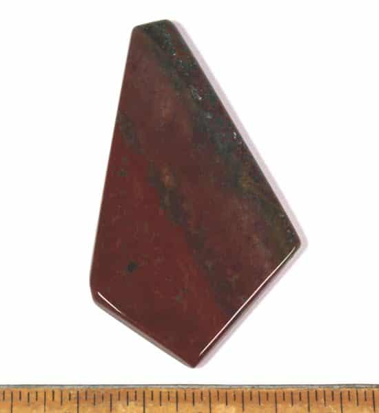 CB104  Here is a very pretty and highly polished Fancy Jasper Cabochon.  It has lovely  dark red colors with green accents in a unique design.  This pretty cabochon measures almost 2 7/8″ x nearly 1 3/4″ wide x almost 16″ thick.  It was cut and polished in our lapidary shop.