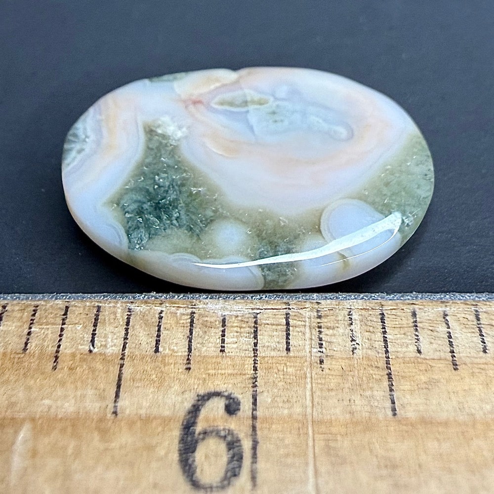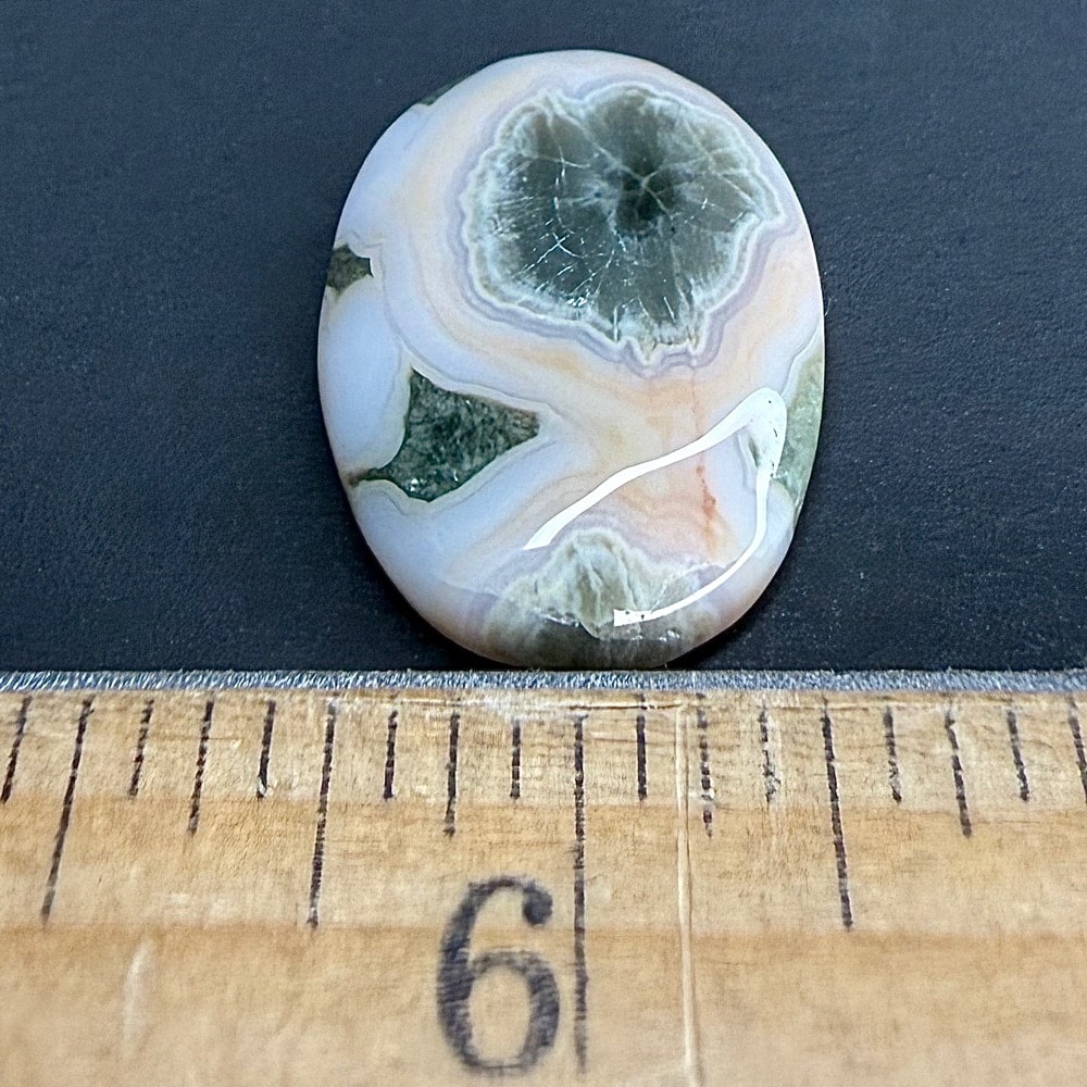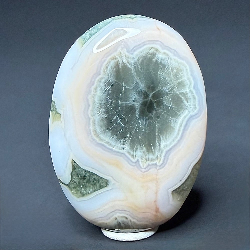 This material is a new find from Madagascar. The deposit formed as a rhyolite flow but has been completely silicified. The Rhyolitic eyes or orbs come in an astonishing array of colors and color combinations. The background can be white, pink, green, red, or yellow. Botryoidal formations as well as white and deep green druzy are also common. This deposit has been discovered at the edge of the ocean. It can only be seen and collected at low tide. The area has no road so the material must be transported to civilization by boat. This material is fast becoming a rarity in the Jasper ocean fields, so get one while it is still available.