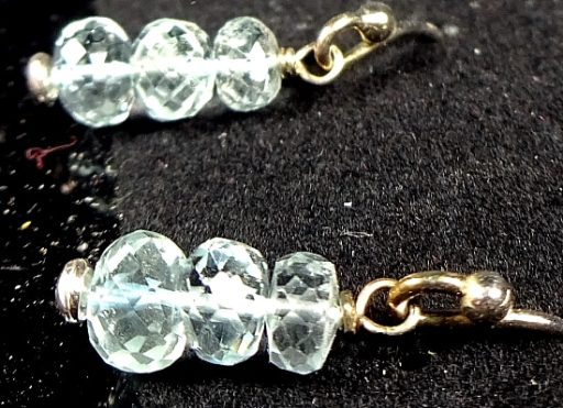 Here is a very pretty set of Aquamarine  Earrings.  The faceted beads measure 3 mm, 2 mm and 1mm and measure 1″ long. They have a beautiful color. These are dangling type earrings for pierced ears.