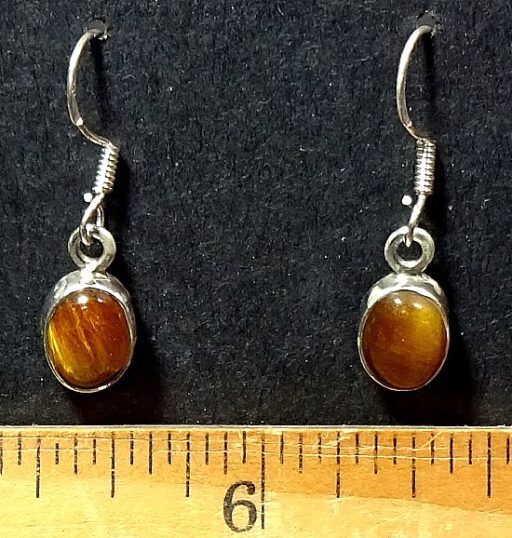 This is a very pretty set of Tiger Eye Earrings mounted in a Sterling Silver setting.  The cabochon measures 6mm x 7mm.  The total length is 1 1/8″ with a French hook wire.  These are a dangle type earring.