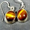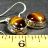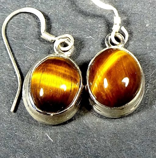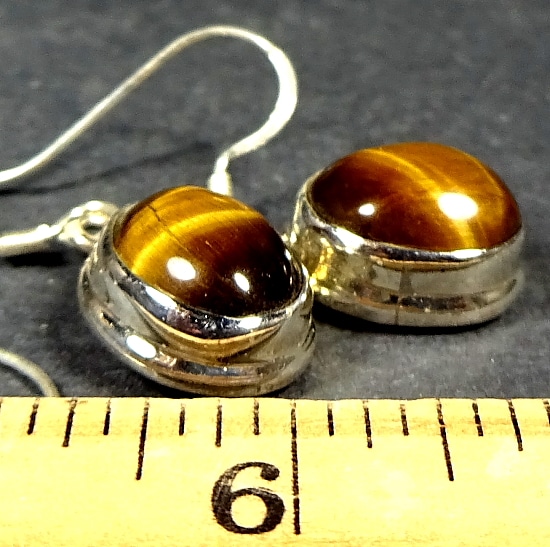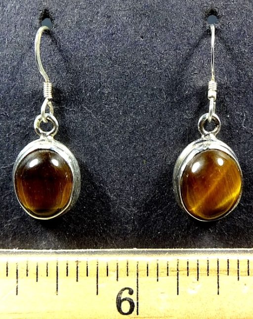 Here is a very pretty set of  Tiger Eye Earrings mounted in a Sterling Silver setting.  The cabochon measures 8 mm by 10mm.  The total length is 1 1/8″ with a French hook wire.  These are a dangle type earring.