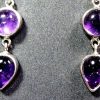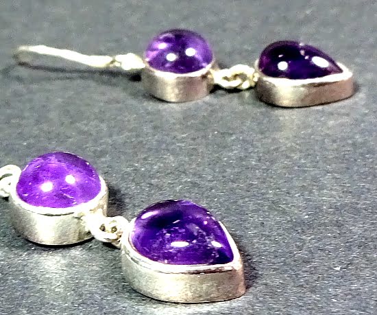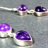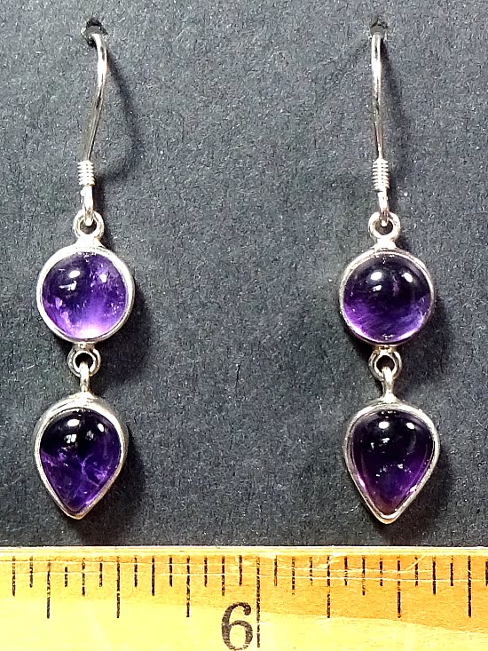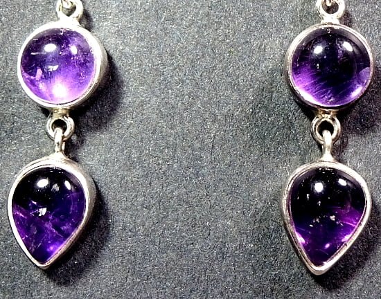 This is a very pretty set of Amethyst Earrings mounted in Sterling Silver settings.  The round cabochons measure 7 mm in diameter and the teardrop cabochons measure 7 x nearly 10 mm.  The total length is almost 1 3/4″ with a French hook wire.  These are a dangle type earring.