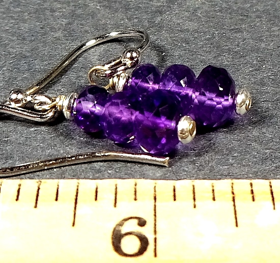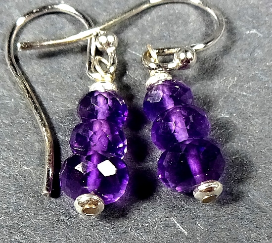 This is a very pretty set of Amethyst Earrings.  The faceted beads measure 5mm, 3mm and 2mm.  The total length is approximately 1″ with a French hook wire.  These are a dangle type earring.