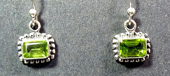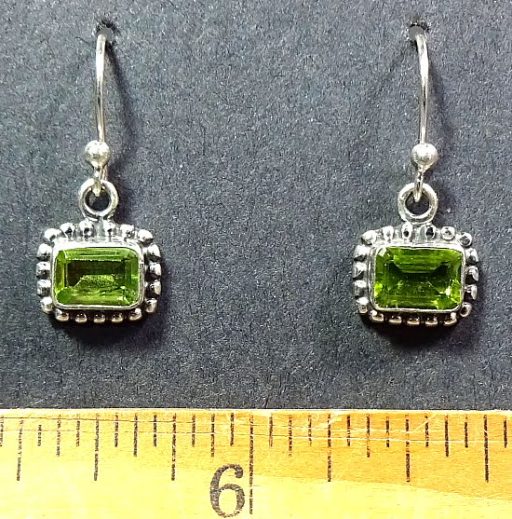 This is a very pretty set of faceted Peridot Earrings mounted in a Sterling Silver setting. Each rectangle cabochon measures 4mm x 7mm respectively. The total length is 1″ with a French hook wire. These are a dangle type earring.