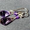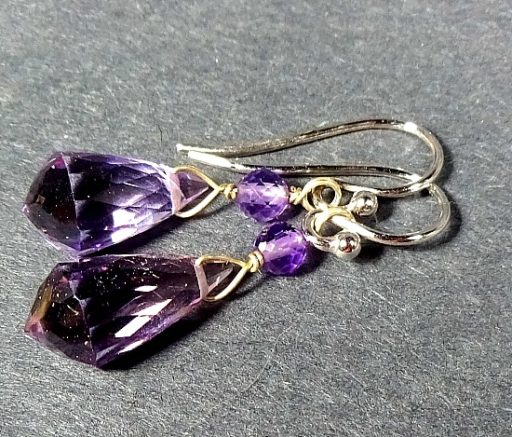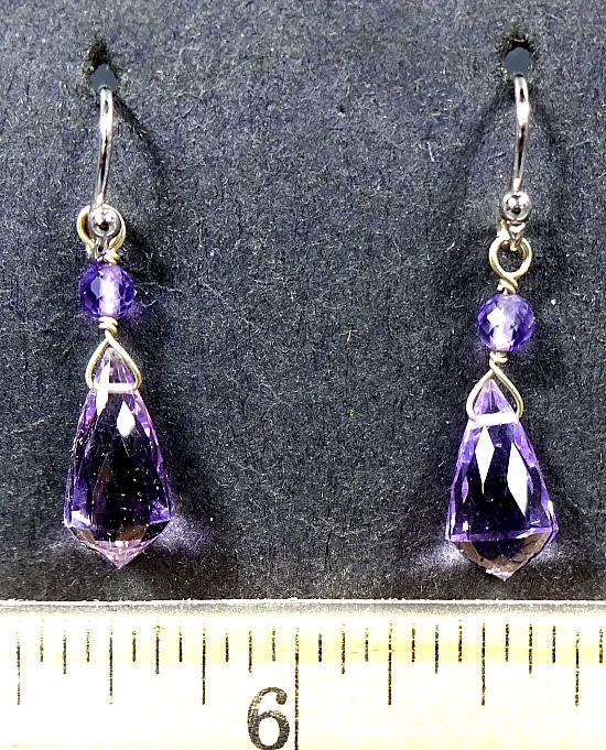 This is a very nice set of  faceted Rose de France Amethyst Earrings from India. Each bead measures 5mm x 6mm with an additional 2mm bead. The total length is 1 1/4″ with a French hook wire. These are a dangle type earring.